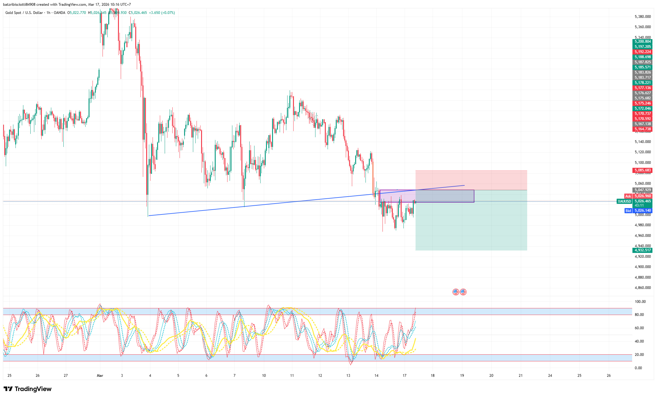 Cấu trúc giá: Biểu đồ Vàng cho thấy một sự suy yếu toàn diện. Điểm chí mạng mang tính kỹ thuật là giá đã chính thức đánh thủng đường Trendline hỗ trợ chéo (đường màu xanh) kéo dài từ các đáy trước đó. Hiện tại, nến H1 đang lao dốc và kiểm tra mốc hỗ trợ tâm lý $5.000 (hiện ở mức $5.001).