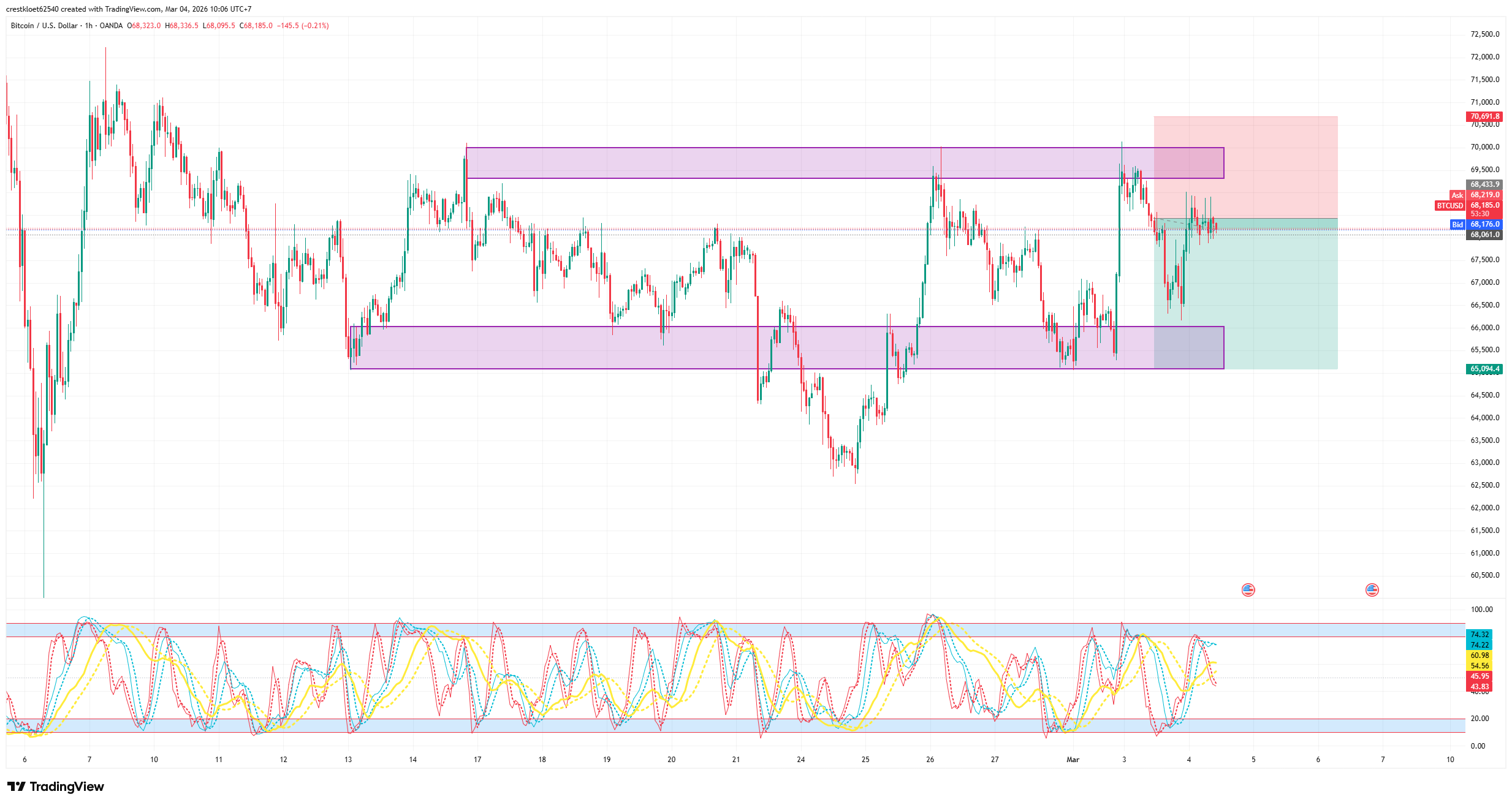 表现与结构: 与黄金的强势相反,比特币刚刚对 69,440 附近的强阻力区进行了一次重新测试(Retest),但未能成功。强劲的抛售压力迫使价格掉头,目前正回落至 $68,313 附近交易。H1 周期明显承受着来自前期高点的供应压力。