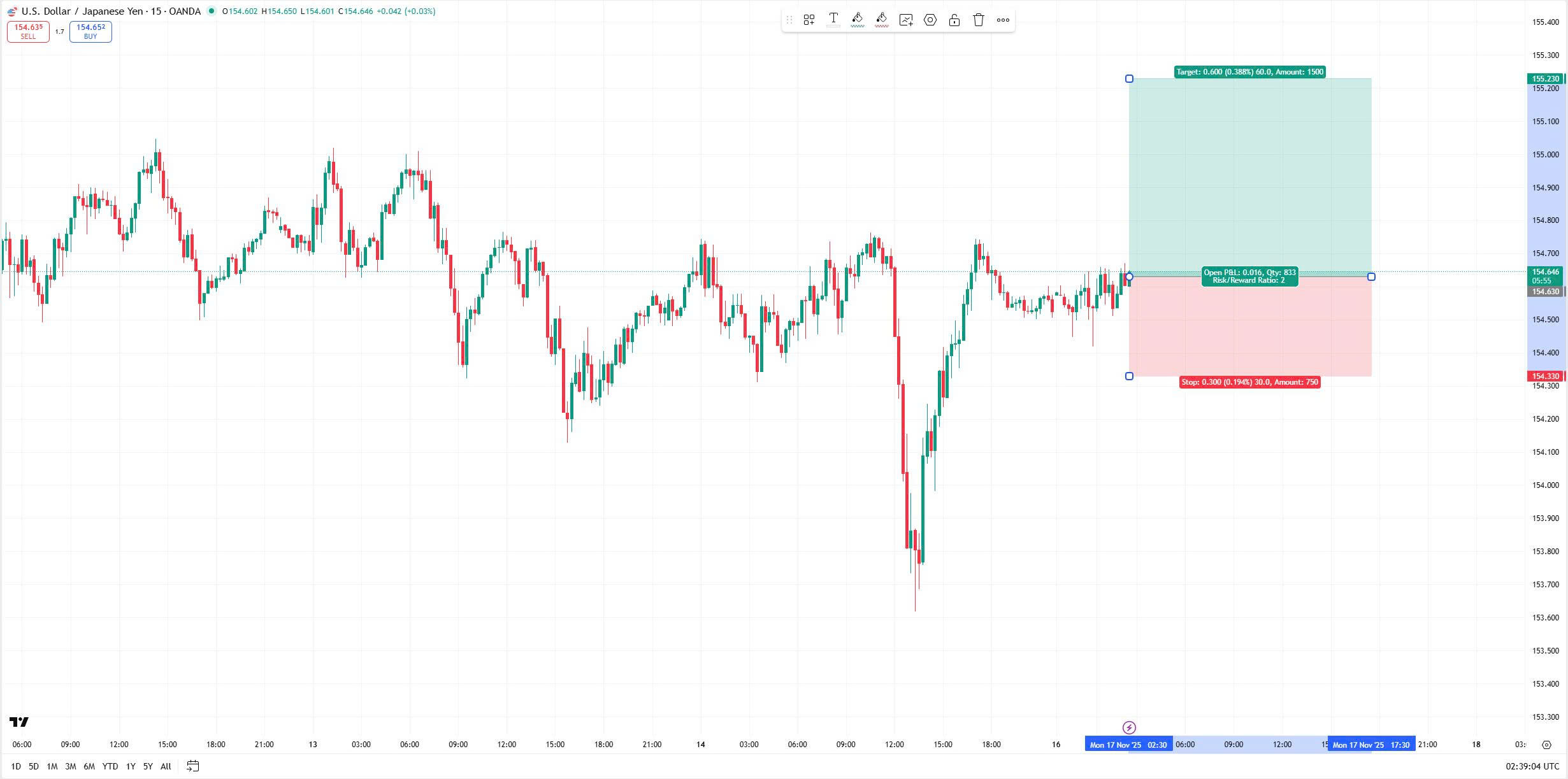 Sell at 154.630, stop loss 154.330, take profit 155.230