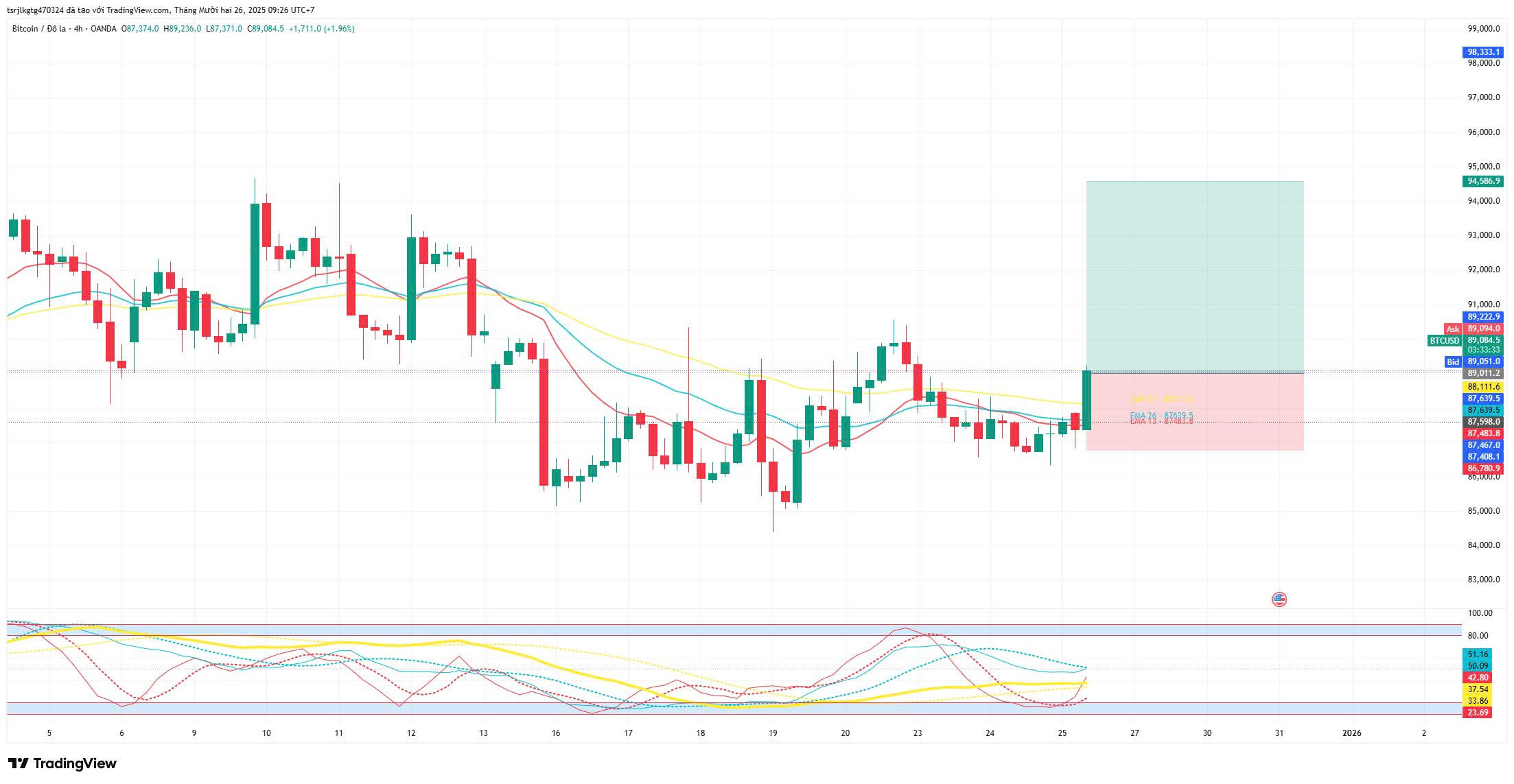 Đúng như kỳ vọng về một cú hích phá vỡ sự ảm đạm, BTC vừa có một pha "Pump" (tăng giá) dựng đứng, phá tan mọi kháng cự. Một cây nến xanh khổng lồ đã đẩy giá từ vùng $87k vọt thẳng lên $88.893. Phá vỡ: Quan trọng nhất, BTC đã đục thủng hoàn toàn "trần nhà" EMA 53 (dây màu vàng) tại $87.494, chính thức xác nhận xu hướng Tăng ngắn hạn đã trở lại.