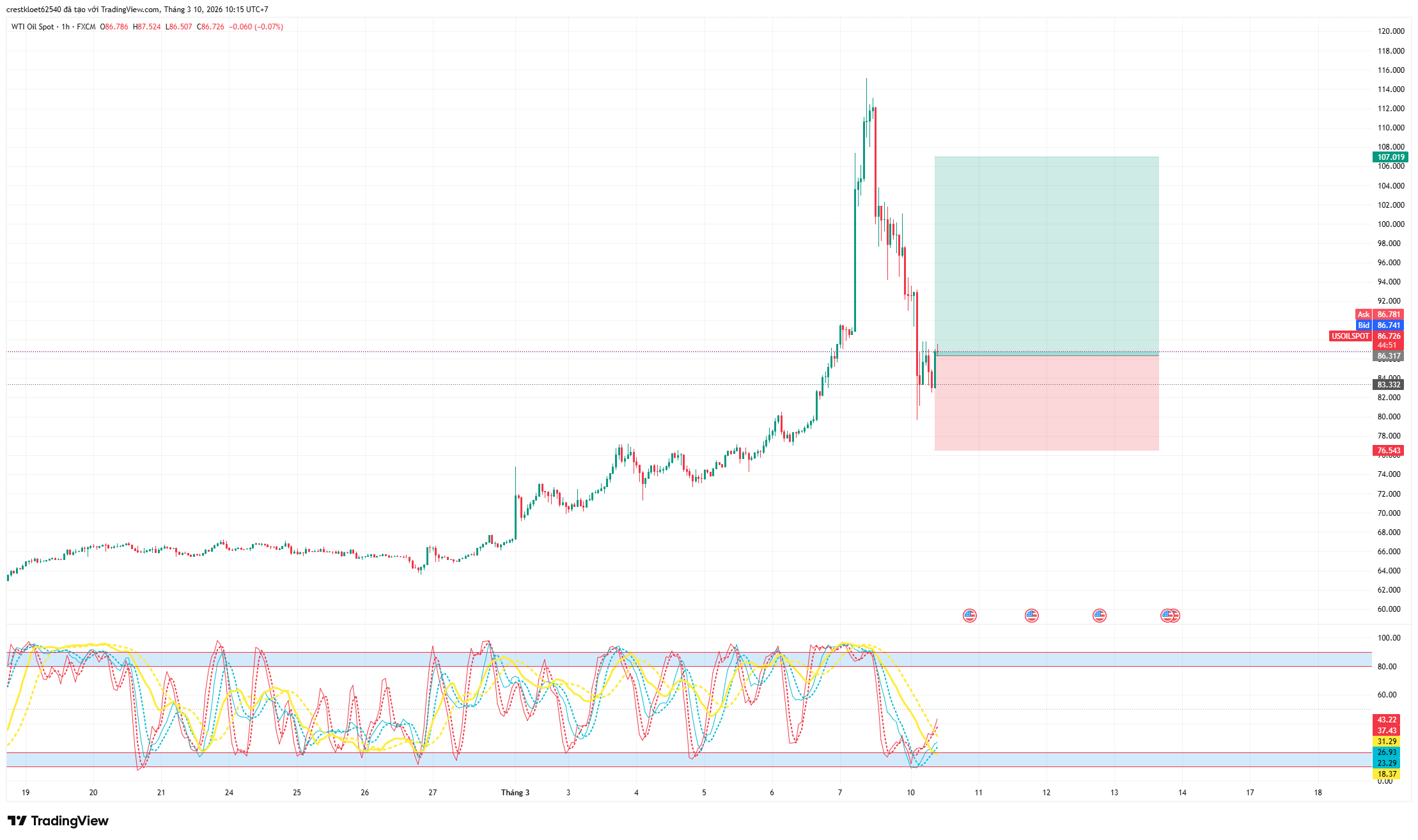 Cấu trúc giá: Biểu đồ Dầu cho thấy toàn bộ đà tăng sốc (Blow-off top) trước đó đã bị xóa sổ hoàn toàn. Lực bán tháo đã ép giá rơi thẳng đứng từ đỉnh trên $114 về tận vùng $83 trước khi chững lại. Hiện tại, Dầu đang nỗ lực cầm máu và đi ngang tích lũy quanh mốc $87.18.
