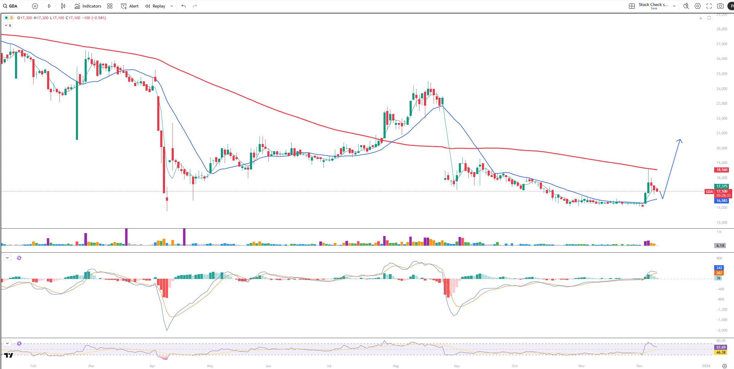 Khuyến nghị MUA GDA (09/12/2025), giá vào 16.500 - 17.100 VNĐ, mục tiêu 1: 18.700, mục tiêu 2: 21.500 VNĐ, cắt lỗ 16.000 VNĐ