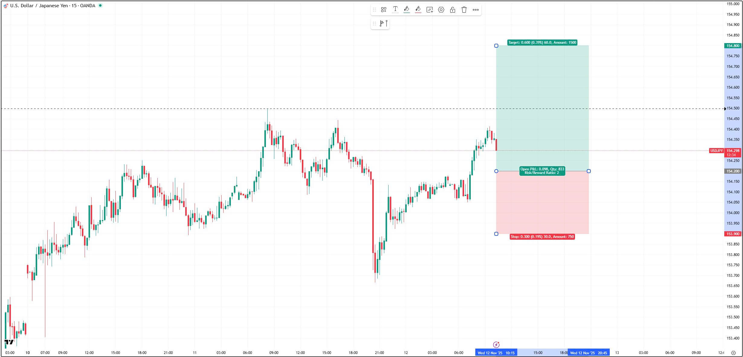 Buy at 154.200, Stop loss 153.900, Take profit 154.800