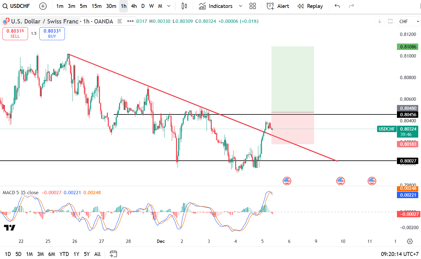 USD/CHF – 限價買入 (Buy Stop) 0.80450,止損 (Stop Loss) 0.80200,止盈 (Take Profit) 0.81000