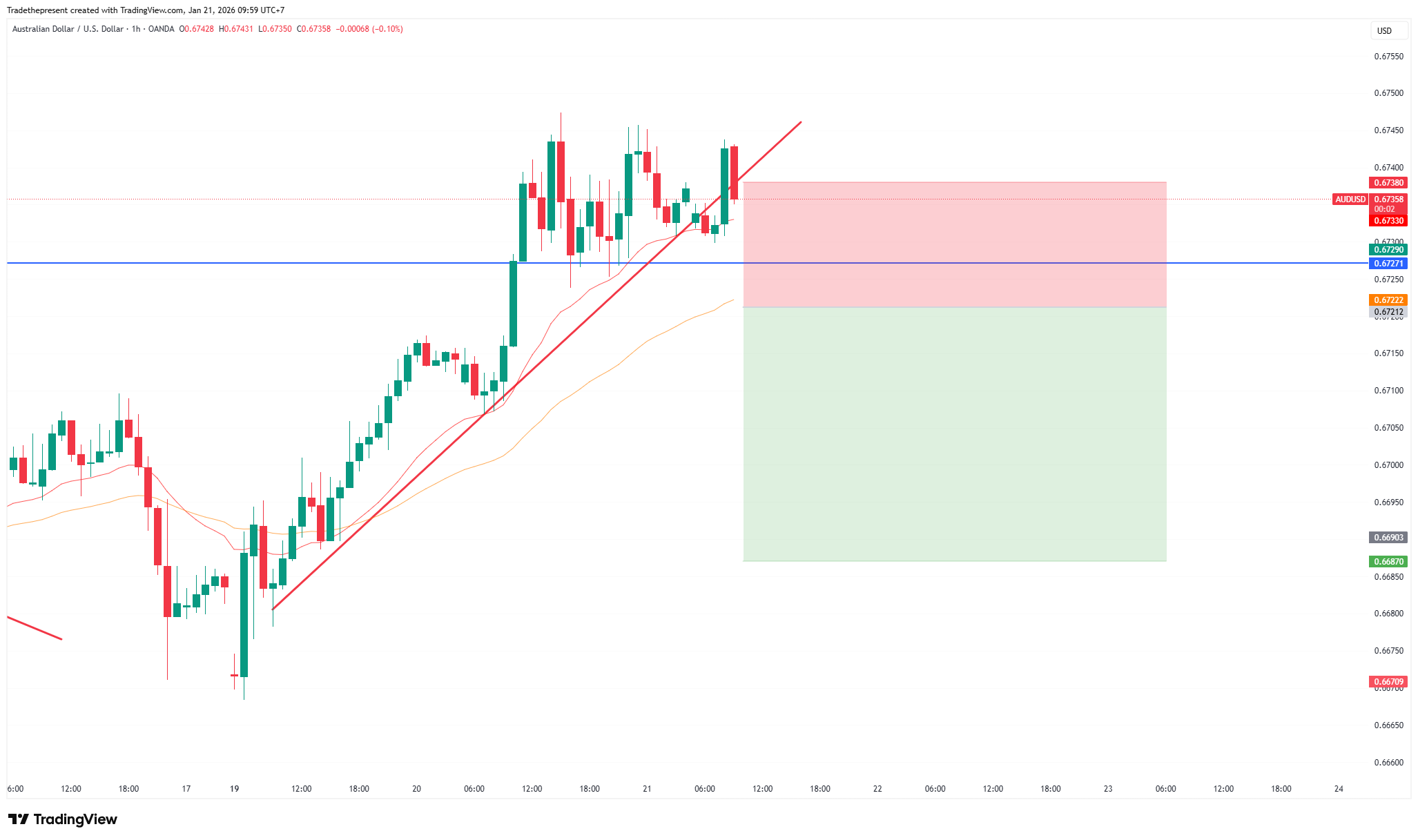 AUD/USD: 0.67200 挂单卖出 (Sell Stop) | 止损:0.67400 | 止盈:0.66800