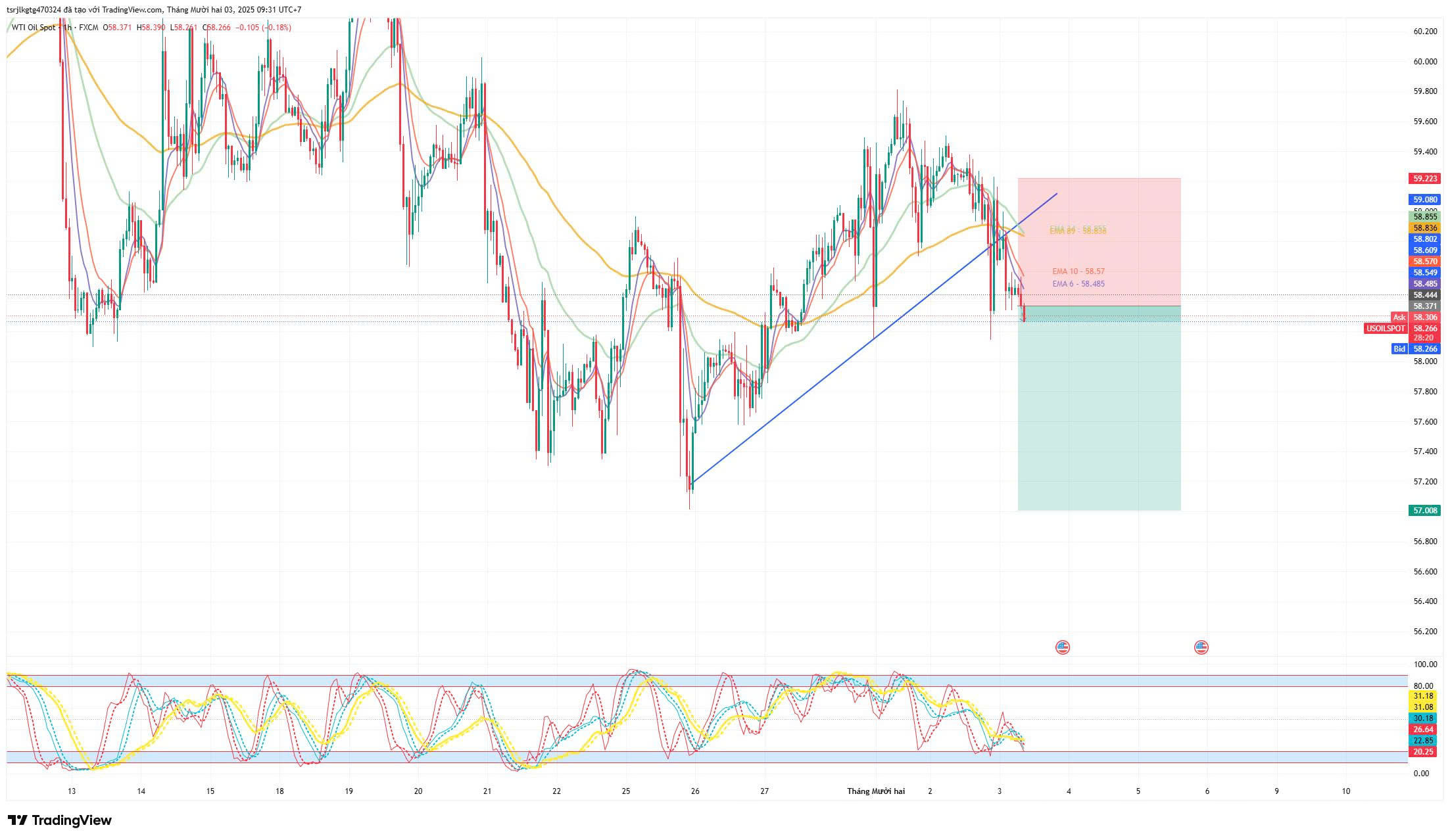 USOIL (美國原油): 趨勢:下跌。賣出(Sell)在58.309,止損59.2,止盈57