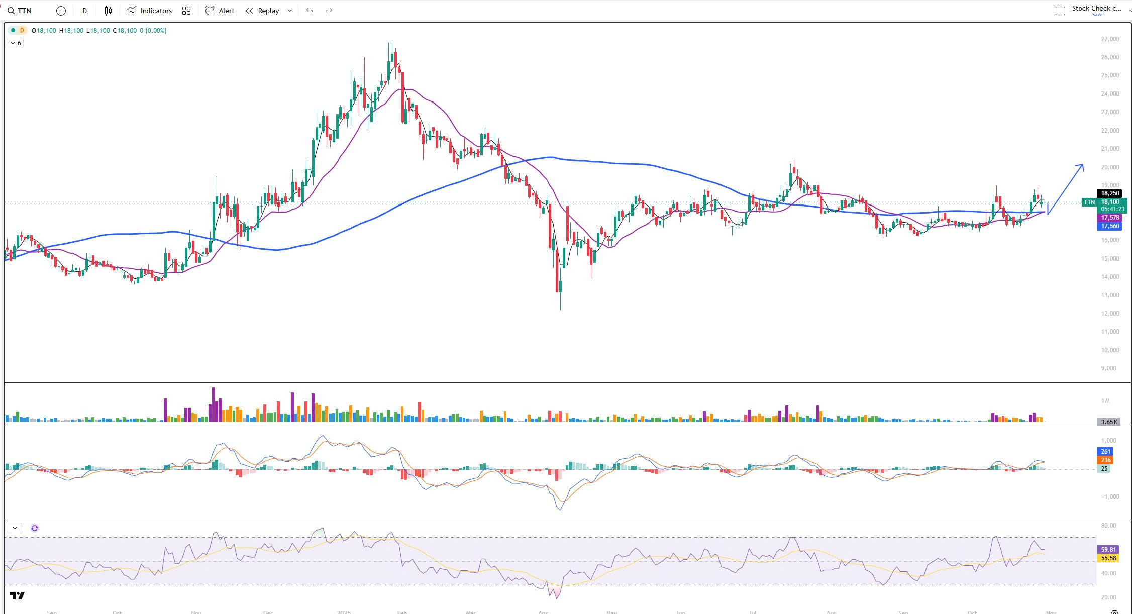Wait to buy TNN (30/10/2025). Entry price 17,300–17,700 VND; Target 1: 19,500; Target 2: 22,000 VND; Stop-Loss: 16,500 VND