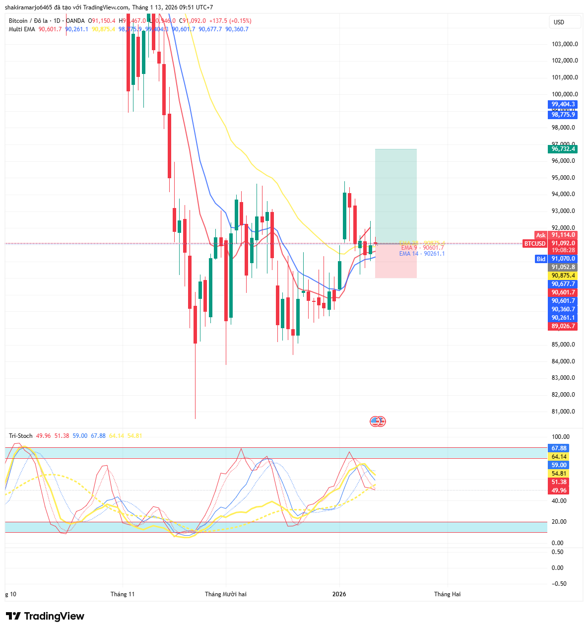 · Diễn biến: BTC đang giao dịch trong trạng thái "ru ngủ" quanh mức $91.191. Giá đang bị kìm kẹp bởi một đường trendline giảm (dây màu đỏ kẻ chéo) đóng vai trò là kháng cự cứng phía trên.