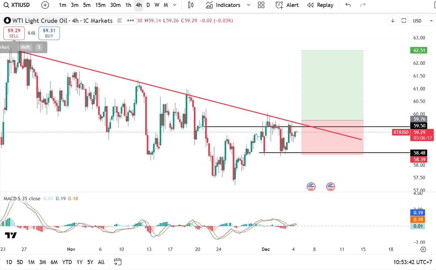 XTI/USD: The dominant trend is Bearish. Daily resistance: 59.50; Daily support: 58.50. Consider Long positions if price breaks the daily support zone.