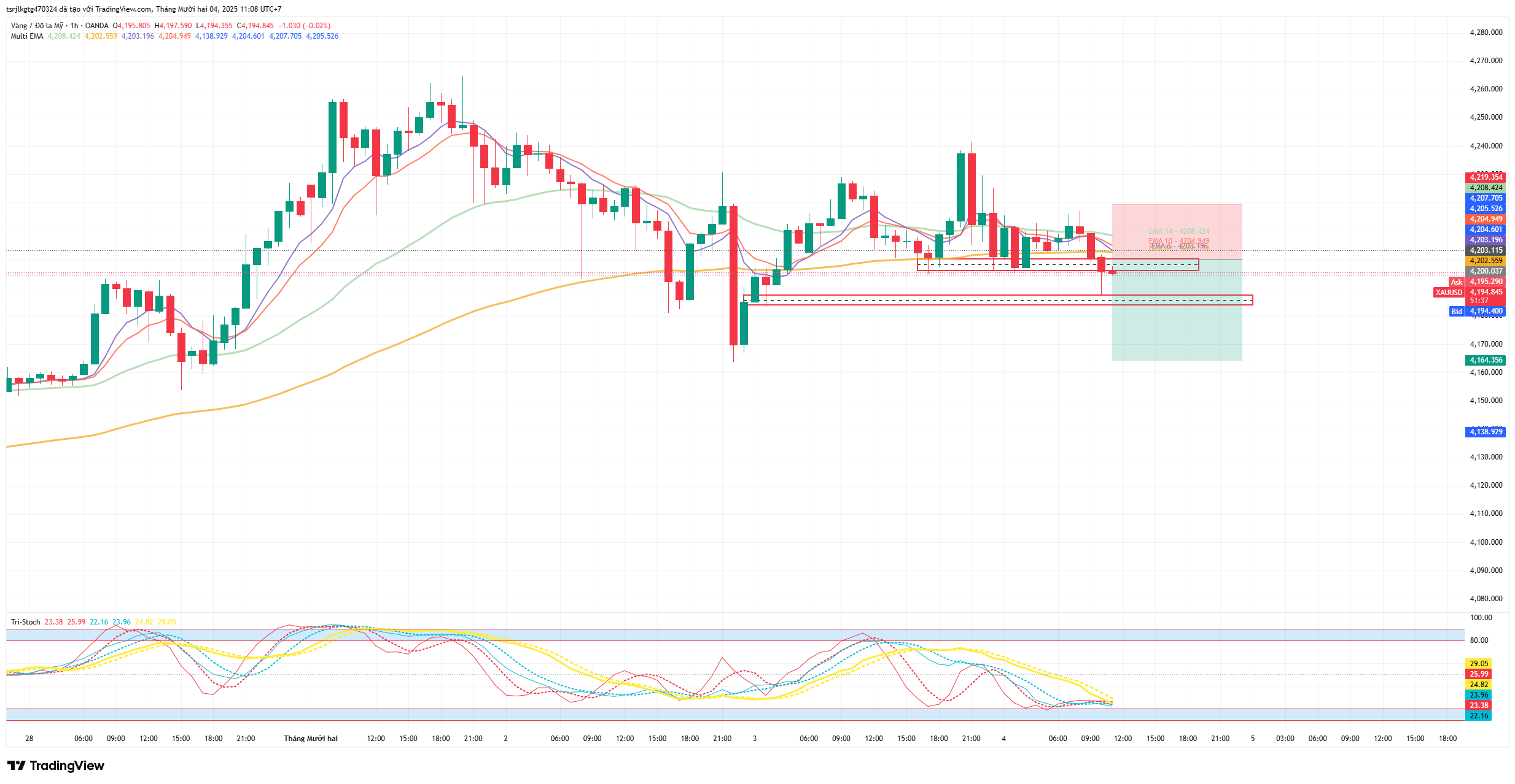 3. Gold: Has BROKEN the "lifeline" EMA 89 (zone $4,202) with a decisive sell-off candle down to $4,195. The trend has reversed to Short-term Bearish, and the Bears are controlling the game.