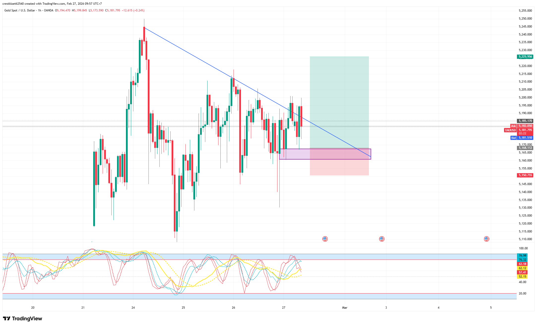 Performance & Structure: Gold is currently trading around $5,190 and entering a very clear Consolidation phase. After the decline from the peak, the price is being compressed under a diagonal resistance Trendline (the blue slanting line connecting the lower highs). This price action acts more like "digesting" profit-taking pressure rather than a sell-off.