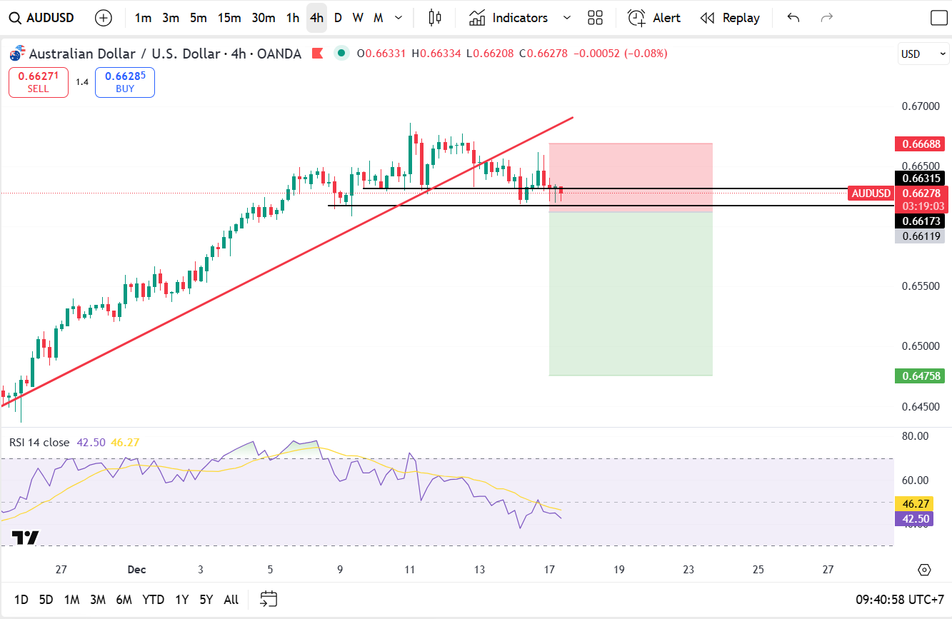 AUD/USD: Sell Stop at 0.66100 | Stop Loss: 0.66700 | Take Profit: 0.64700