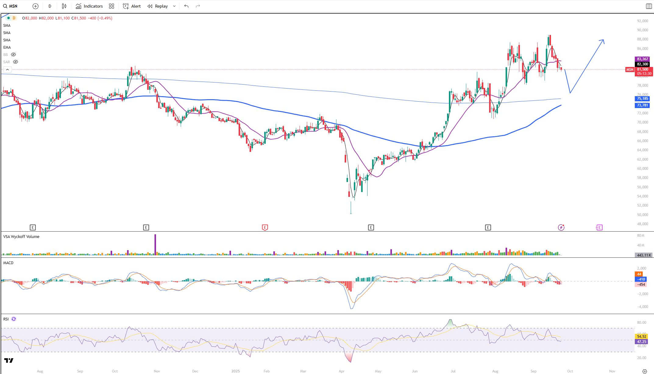 Recommendation: WAIT TO BUY MSN (24/09/2025). Entry: 76,000–79,000 VND. Target 1: 84,000 VND. Target 2: 89,000 VND. Stop loss: 73,500 VND.