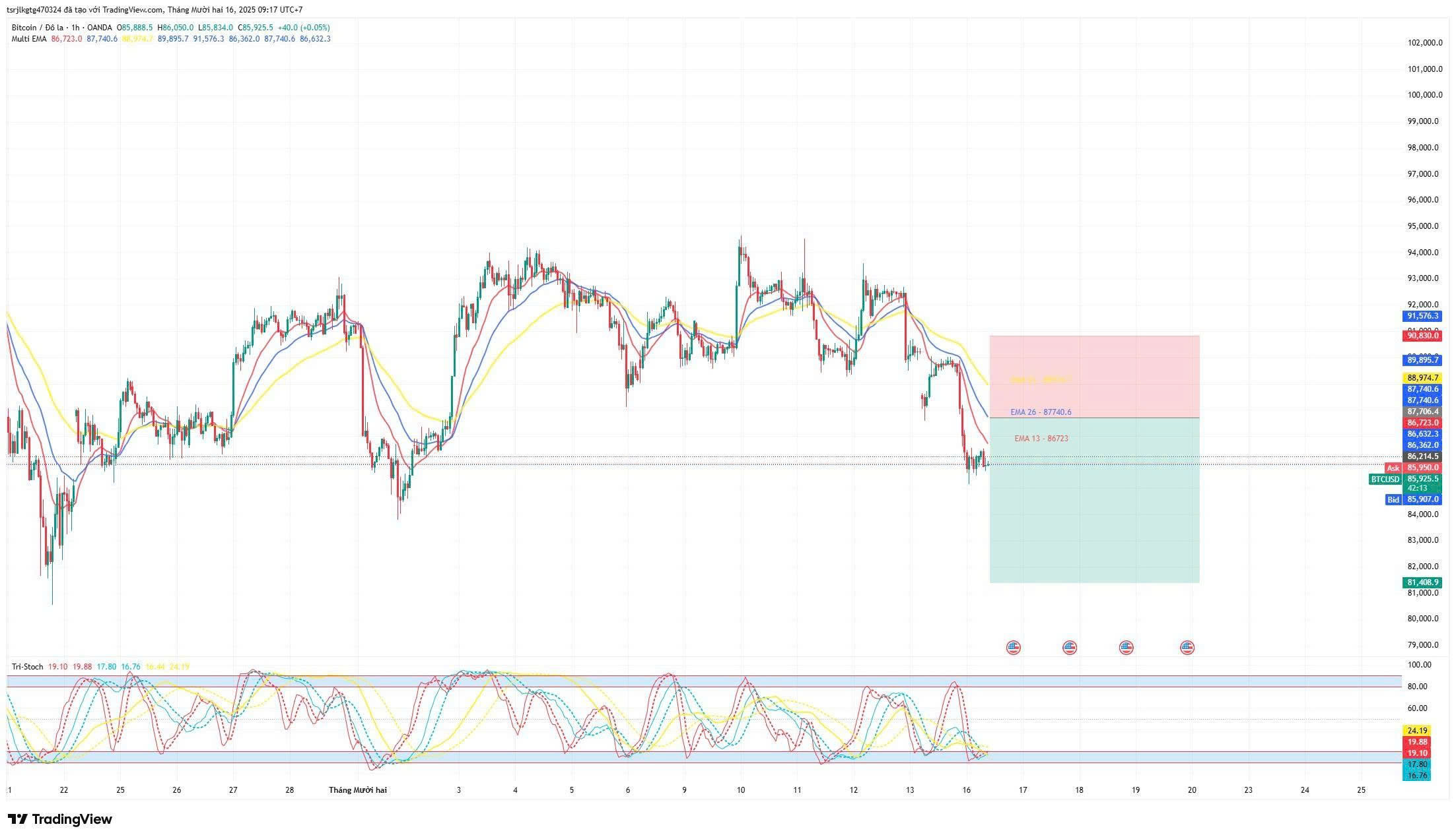 The worst-case scenario has unfolded: BTC has decisively broken below the $89,000 support level (ascending trendline) and plunged sharply to around $86,214. The current price structure is extremely weak, with price trading entirely below downward-expanding EMA lines, signaling strong selling pressure. Although the Stochastic indicator has entered oversold territory, this move resembles a “falling knife,” making bottom-fishing highly risky until a new price base is established.