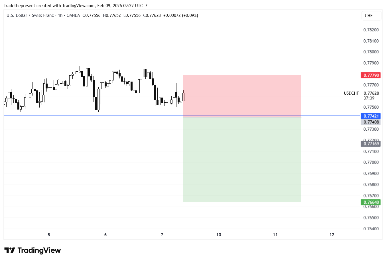 Sell Stop (止损卖单) 于 0.77400,止损 (SL) 0.77800,止盈 (TP) 0.76600。