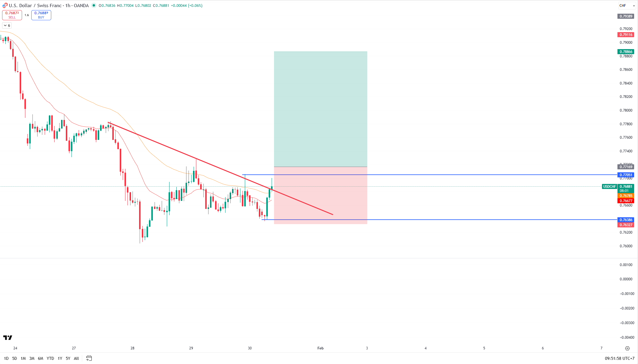 美元/瑞郎 (USD/CHF): 主导趋势为横盘。日内阻力位:0.77700;日内支撑位:0.76400。若价格突破日内阻力区,可考虑建立多单 (Buy)。
